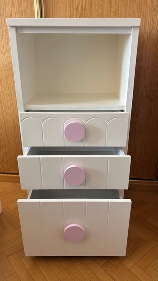 Cómoda infantil con un diseño moderno y funcional. - Tres cajones con tiradores redondos en color rosa. - Acabado principal en blanco. - Estructura con detalles decorativos en la parte superior.