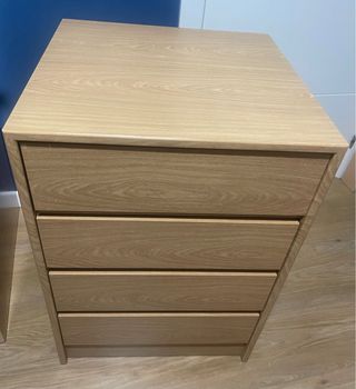 Cómoda alta de IKEA con cinco cajones. Su diseño es sencillo y funcional, aportando un toque de orden a cualquier habitación. Las manchas que se aprecian en las fotos son nudos de la propia madera. - Cinco cajones amplios. - Tiradores redondos negros.