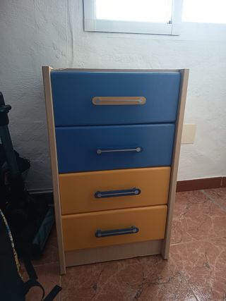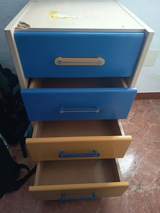 Cajonera juvenil con un diseño moderno y divertido, perfecta para habitaciones infantiles o juveniles. Sus colores vibrantes añaden un toque alegre al espacio. - Estructura de madera con frentes de plástico. - Tiradores de diseño. - Cuatro cajones amplios.