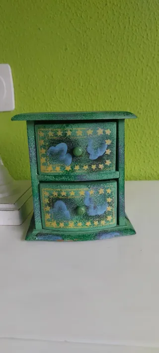 Pequeña cajonera de madera con un diseño encantador, monísima, dos cajo es para guardar de todo, anillos, joyas, etc. La madera lleva dubujo pintado.. Muy bonita y juvenil. Sin estrenar - Color verde con detalles pintados. - Dos cajones con tiradores redondos. - Decoración de mariposas y estrellas.