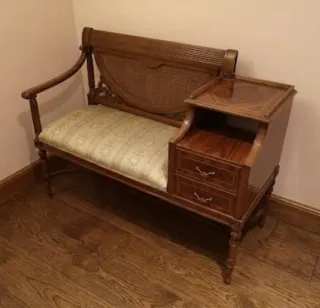 Elegante sillón de estilo clásico con detalles de ratán y una práctica cajonera integrada. - Tapicería en tonos beige. - Estructura de madera en color marrón. - Diseño con respaldo de ratán. - Cajonera con dos compartimentos. A recoger en origen.