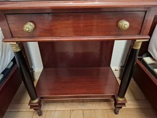 Elegante mesita de noche con un diseño clásico, con columnas negras. Espejo a juego. - Cajón con tiradores dorados. - Patas de madera con detalles dorados. Mas de la misma habitación en mi perfil. Usado, algunas marcas de uso. Cajonera con llave. Medidas. Mesita: 53cm de ancho, 35 cm de fondo y 63cm de alto. No hago reservas. Mesita 30€ Espejo 30€