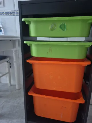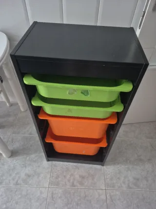 Práctica cajonera con cuatro compartimentos para organizar tus cosas. - Estructura negra. - Dos cajones verdes. - Dos cajones naranjas.