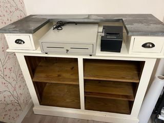 Mueble de recepción con diseño moderno y funcional. - Encimera de piedra. - Cajones con tiradores. - Estanterías interiores. 1’30 de ancho 80 alto aproximadamente