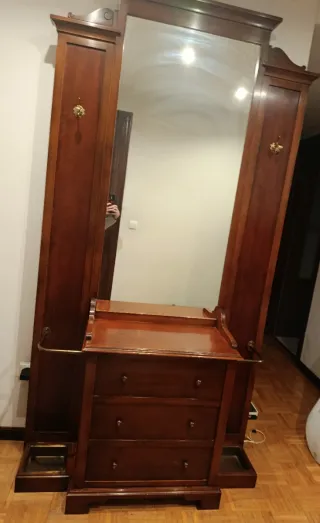 Mueble recibidor con espejo, cajoneras y perchero.