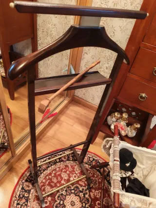Mueble auxiliar de madera con detalles dorados, combina la funcionalidad de un galán de noche con la de un costurero. El costurero con tela bordada y bolsito de agujas y demás lsnires de costura Se venden las 2 cosas juntas! - Estructura principal de madera oscura. - Bandeja superior para accesorios. - Barra para colgar pantalones. - Base con ruedas para fácil movilidad.