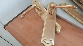 MESA DE 3 CAJONES, TIRADOR Y CANTO DORADO..