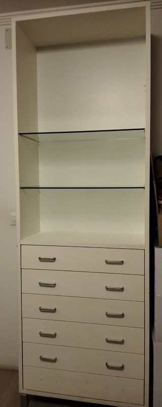 Mueble cajoneras almacenamiento, pintado en blanco con pintura a la tiza , necesitaría otra mano de pintura, el mueble está en buen estado y tiene mucha capacidad de almacenamiento.