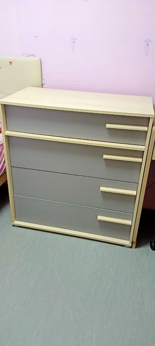 Cajonera de 4 cajones. Medidas: 85.5x 90x 47. La tapa, laterales y tiradores en madera claro El frontal del los cajones en gris En muy buen estado (pequeño desconchón en el interior del primer cajón, última foto) Recoger en mano en Reus