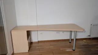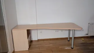 Por jubilación y cierre de taller vendo mesa de despacho de 1,80 X 0,80 mts. con cajonera de 4 cajones a juego. Color haya y patas gris oscuro. Con la compra de la mesa regalo 2 sillas de visitas, la silla giratoria verde ya no está. Se puede desmontar por piezas. No se envia