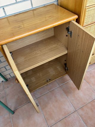 Conjunto de dos muebles auxiliares con estructura de madera y detalles en mimbre. - Diseño natural y cálido. - Acabado en tonos beige y marrón. Medidas aprox. cajonera alta: - alto: 101 cm - ancho: 50 cm - profundidad: 37 cm Precio: 60€ Solo tiene un pequeño desperfecto (ver foto) Medidas aprox. mueble puertas: - alto: 77 cm - ancho: 62 cm - profundidad: 37 cm Precio: 60€ Si se compran juntas el precio de las 2 es: 110€