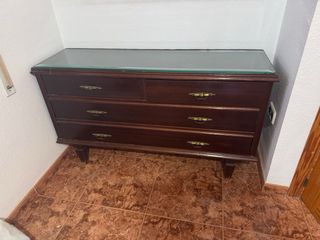 Mueble de madera con tapa de cristal. - Diseño elegante y funcional. - Cajones con tiradores dorados.