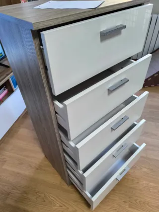 Cajonera de madera con cinco cajones. Su diseño sencillo la hace versátil para cualquier habitación. Los cajones estan perfectos. Abren y cierran con mucha facilidad. - Cinco cajones amplios. - Tiradores de madera. - Acabado en blanco.
