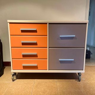 Cajonera de diseño moderno con ruedas para facilitar su movilidad. Cuenta con una combinación de cajones en dos colores. - Cajones de color naranja 4 y marrón 2 XL. - Estructura de madera. - Ruedas para desplazamiento con freno.