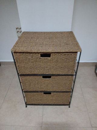 Práctica cajonera con estructura de metal y cestas de mimbre. - Tres cajones amplios. - Diseño moderno y funcional. 90cm alto 45cm ancho