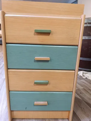 Cajonera de madera con cinco cajones, combinando tonos naturales y un toque de color. - Diseño de cinco cajones. - Tiradores de madera y pintados en verde.