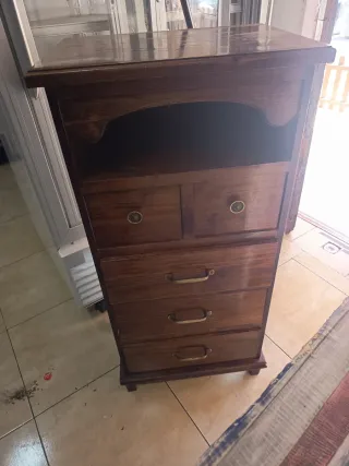 Bonito mueble de madera con cuatro cajones. Tiene un estilo rústico y está en buenas condiciones. Se vende por mudanza. - Perfecto para dormitorio o salón. - Color marrón oscuro.