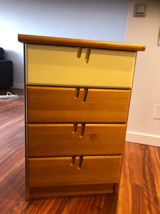 Preciosa cajonera de madera, ideal para dormitorio infantil o cualquier habitación. Se encuentra en buen estado. - Tiene cuatro cajones amplios y espaciosos. - El cajón superior es de color amarillo claro. - Perfecta para organizar la ropa u otros objetos.