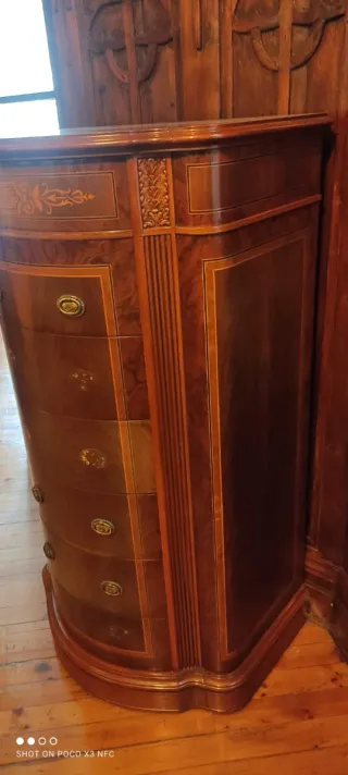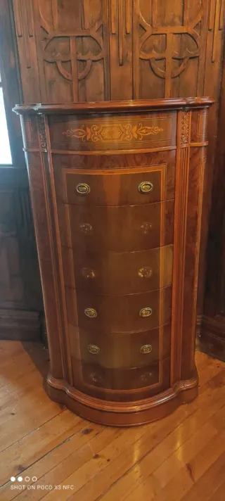 Elegante cajonera de madera con un diseño curvo y detalles decorativos. - Acabado en tonos marrones y dorados. - 6 cajones para almacenamiento. - Tiradores metálicos (falta alguno). - Diseño con marquetería en la parte superior.