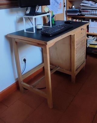 Escritorio antiguo de madera con cajonera con cierre de persiana con llave. Restauramos el tablero de la mesa y pusimos papel pegado, con terminado de pizarra, queda muy bien.