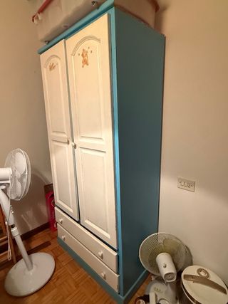 Armario de madera con un diseño encantador, perfecto para habitaciones infantiles. Combina acabados en blanco y azul. - Dos puertas principales con tiradores. - Dos cajones inferiores para almacenamiento adicional. - Detalles decorativos de ositos en las puertas. PRECIO NEGOCIABLE