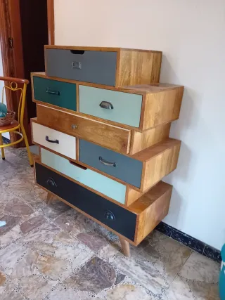 Cajonera de diseño con múltiples cajones de diferentes colores y acabados. El cajón marrón no cierra bien, habría que lijarlo un poco, por el resto está en perfectas condiciones.