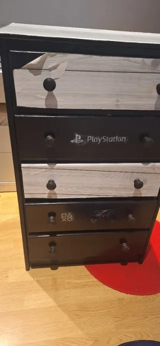 Cajonera de pino. Estaba pintada de negro con vinilo. Físicamente esta perfecta, solo es necesario tunearla a tu gusto. - Tiradores redondos