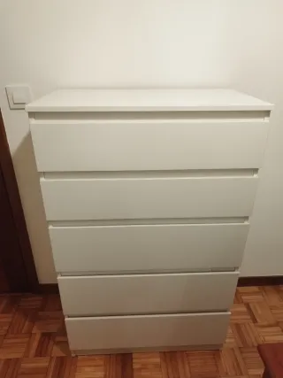 Se vende conjunto de muebles de almacenaje de Ikea. Incluye una cómoda de cinco cajones y dos mesitas de noche. - Cómoda con cinco cajones amplios. Cómoda de 5 cajones, blanco, 70x40x112 cm - Dos comodas de noche a juego. Comoda de 2 cajones, blanco, 35x49 cm No está desmontando, el comprador lo tiene que desmontar.