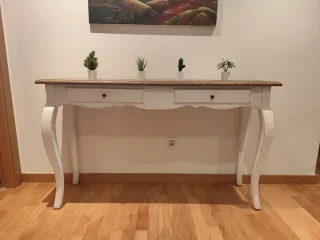 Elegante mesa auxiliar de madera, perfecta para recibidores o pasillos. - Diseño clásico con patas curvas. - Acabado en blanco y madera natural. Medidas Ancho: 130cm Fondo: 35cm Altura: 75cm