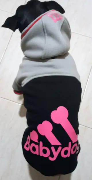 Chaqueta para perro con un diseño moderno. - Parte superior gris con detalles rosas. - Parte inferior negra con estampado de huesos y el logo Babydog en rosa. - Capucha integrada.