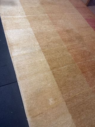 Alfombra de salón con un diseño degradado de colores cálidos. - Diseño a rayas verticales. - Tonos que van del beige al naranja rojizo. - Textura suave al tacto.
