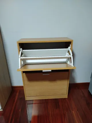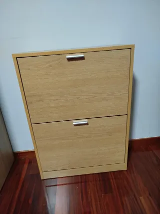 Mueble zapatero moderno y funcional. - Dos compartimentos amplios para organizar calzado. - Tiradores metálicos plateados. - Acabado en tono madera natural.