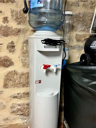 Dispensador de agua de pie en color blanco. Cuenta con dos grifos para agua caliente y fría. - Dispensador de agua con botella superior. - Grifo rojo para agua caliente. - Grifo azul para agua fría. - Bandeja recogegotas.