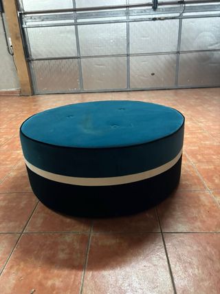 Puf original de la marca Rue Vintage 74, tapizado en terciopelo en tonos blanco, negro y azul. Muy cómodo y decorativo, ideal para salón, dormitorio o zona chill out. Aporta un toque elegante y moderno al espacio. Medidas aproximadas: 1 m de diámetro y 0,5 m de alto. En buen estado, sin roturas ni desperfectos importantes, solo un poco sucio.