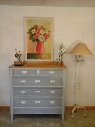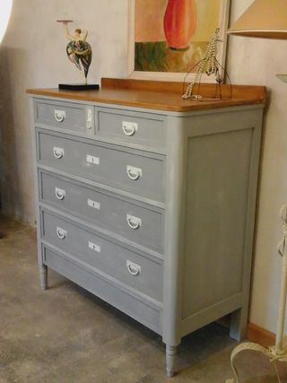 Cálida y acogedora cómoda antigua. Antigüedad de los años 1940 a 1950. Completamente restaurada. Pintada a mano 2 tonos de grises, tiradores en blanco roto. Ligeramente decapada . Sobre de madera maciza y barnizado a muñeca. Los cajones han sido barnizados por dentro. Medidas : 1,13 x 0,50 x 1,14 de alto. GRACIAS.