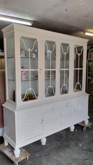 Espectacular Vitrina aparador antigua. Completamente restaurada. Se desmonta en dos partes, lo que es Vitrina y la parte inferior de puertas y cajones. Pintada artesanalmente de blanco roto al agua. Una impresionante vitrina que hará donde esté, un espacio brillante y espectacular. Dispone de 2 estantes de cristal. En la parte inferior 4 cajones. 2 puertas con dos estantes interiores en cada lado. Las cerraduras funcionando con sus llaves. Medidas: 191 de largo X 48 de fondo X 199 de alto. - Diseño clásico con puertas de cristal. - Estructura de madera. - Detalles ornamentales.