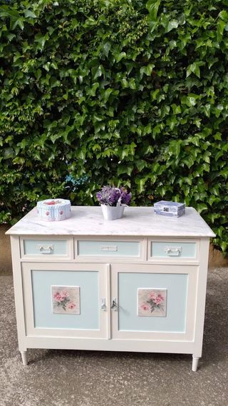 Precioso mueble antiguo. Completamente restaurado. Si se quiere, puede servir para poner una pica de lavabo, esta preparado por dentro. El cajón de el medio es falso para poner el desague.. Tiene dos cajones reales laterales. El sobre de mármol tiene algunas manchas por su antiguedad. Pintado a mano de color blanco roto y azul cielo. Puertas decoradas en relieve con decoupage. Medidas: 1,04 X 0,54 X 1,03 ALTO.