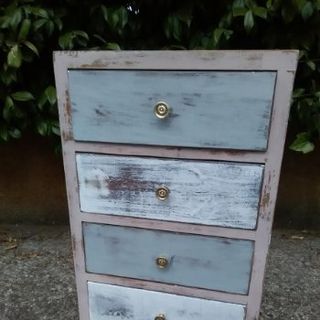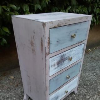 Preciosa mesita de madera con un estilo vintage encantador. Ideal para cualquier rincón de tu hogar. Medidas. 34 X 25 X 60 - Tiene cuatro cajones espaciosos. - Acabado desgastado, aportando un toque rústico.