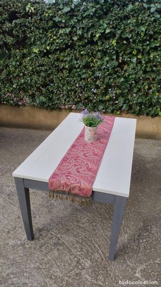 Preciosa mesa de comedor vintage de madera maciza. Tiene un diseño elegante y atemporal. Bonita mesa de comedor Vintage, toda maciza. Restaurada y en perfecto estado y fuerte. Pintada en gris y blanco roto. Medidas: 1.60 X 0,90 X 0.75 Altura. Medida: hueco para sentarse 0.63 cm. Es ideal. - Para envíos consultar. - Color gris y blanco. - Perfecta para cualquier comedor.