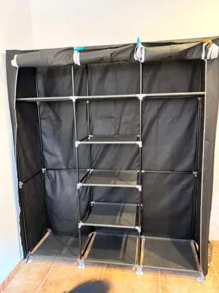 Armario de tela con estructura metálica y un diseño práctico. - Amplia barra para colgar ropa. - Varias baldas para organizar. - Fácil de montar y desmontar.