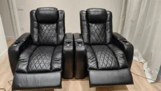 Dos butacas con motor reclinable, perfectas para crear tu propia sala de cine en casa. Diseñadas para el máximo confort (se puede reclinar, adaptar los lumbares, el reposacabezas...). De la marca Valencia Home Theater Seating, modelo Tuscany. Dimensiones: 95x110x102 cm. - Tapicería en piel de alta calidad. - Color negro. - Luces led azules - Cuadro de mandos - Incluye posavasos. - Almacenaje en los reposabrazos Están como nuevas pero las vendo a ese precio porque al gato le ha dado por limarse las uñas en las esquinas. Es el único defecto que tienen. Por lo demás, se han usado poquísimo. NO REBAJO. Nuevas valen 2000€ cada una.