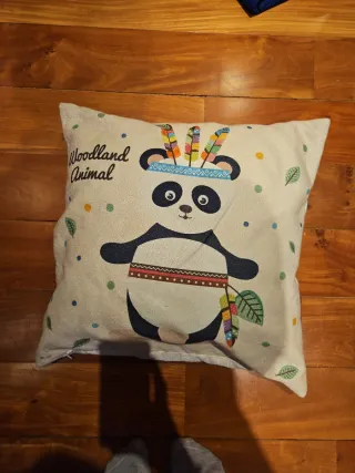 Cojín decorativo con un simpático diseño de panda. - Estampado de panda con motivos tribales y plumas. - Ideal para habitaciones infantiles. - Diseño de animales del bosque.