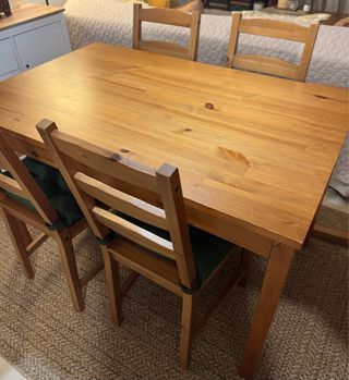 Mesa de comedor de madera maciza de Ikea. - Diseño robusto y duradero. - Acabado natural de la madera. Marcas de uso (véanse las fotos) pero totalmente funcional y muy bonita. Se entrega tabla y patas desmontadas para su traslado. *NO INCLUYE SILLAS