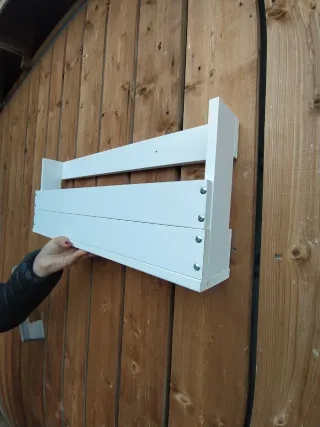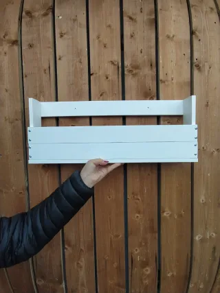 Estante de estilo rústico con acabado blanco lacado. - Diseño de pared. - Construcción robusta. Disponible 6 Uds, a tener en cuenta que uno de ellos tiene una grieta (foto) que necesita encolar, su precio es de 8,00€. Todos están nuevos, tú harás el estreno de su uso!!😉