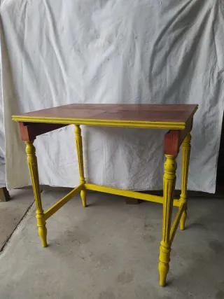 Mesita auxiliar restaurada con un diseño único. - Patas y estructura pintadas en amarillo. - Tablero de madera con acabado natural. - Detalles tallados en las patas.