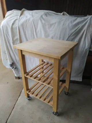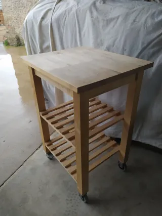 Isla de cocina BEKVÄM de Ikea, con encimera de madera de abedul y dos estantes. IMP! No se encuentra como la original, ya que se añadió ruedas con freno en las otras dos patas. - Estructura de madera de abedul. - Dos niveles de estanterías. - Ruedas para fácil movilidad.