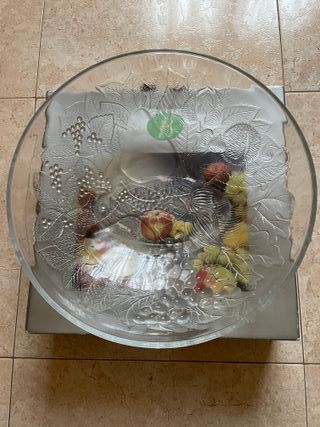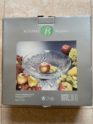 Elegante frutero de cristal de la marca Borgonovo, modelo Autunno. Presenta un diseño con motivos de uvas y hojas. - Material: Cristal. - Diseño: Autunno. - Fabricado en Italia.