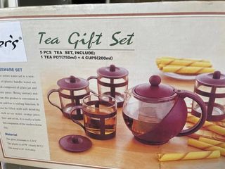 Conjunto de té de cinco piezas, ideal para disfrutar de tus infusiones favoritas. - Incluye una tetera y cuatro tazas. - Diseño elegante en tonos transparentes y beige. - Resistente al calor.