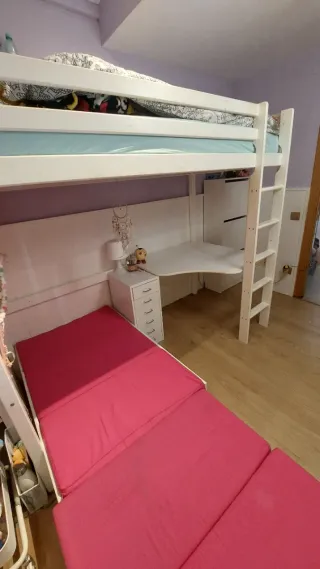 Cama alta para colchón 90 x 200 y espacio inferior de 143 cm sería la zona de descanso, el escritorio debajo de la cama como zona de trabajo y sillón extensible excelente rincón para relax. Se vende sin colchón