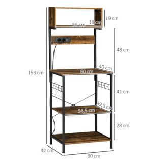 Envio gratis (consulta como) Actualizo cada dia. Estantería de cocina con un diseño industrial y moderno. Cuenta con varios niveles para organizar tus utensilios y electrodomésticos. - Estructura metálica negra. - Tableros de madera con acabado rústico. - Incorpora dos enchufes y un puerto USB. - Incluye una cesta metálica y ganchos laterales.